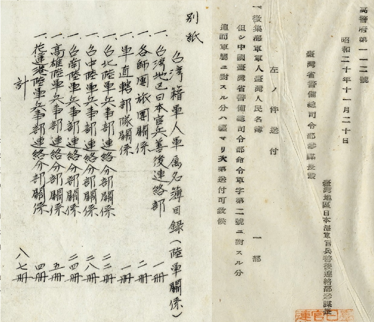 善後聯絡部接到警備總部的命令後沒有絲毫遲疑,於十一月二十日就先由日本海軍高雄警備府將第一批「徵集海軍軍人台灣人民名簿」(高警府第一一二號函)送達警備總部;十二月五日,又由善後聯絡部涉外委員長諫山春樹具函,送交「〈台灣籍軍人軍屬名簿〉目錄(陸軍關係)」,附件包括:台灣地區日本官兵善後聯絡部,一冊;各師團旅團關係,二冊;軍直轄部隊關係,一冊;台北陸軍兵事部連絡分部關係,二十二冊;台中陸軍兵事部連絡分部關係,二十八冊;台南陸軍兵事部連絡分部關係,二十四冊;高雄陸軍兵事部連絡分部關係,五冊;花蓮港陸軍兵事部連絡分部關係,四冊;合計八十七冊。【註五】