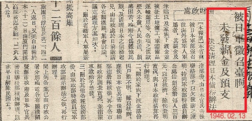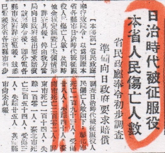 【註九】一九四七年十月五日,《民報》「日治時代被征服役,本省人民傷亡人數,省民政廳奉令初步調查,準備向日政府要求賠償。省民政廳奉行政院令,以為明瞭本省各縣市日治時代被征服役人民傷亡人數,及屆時恤金核定額暨已未領情形,詳查具報,俾由我方當局向日政府提出要求賠償。」