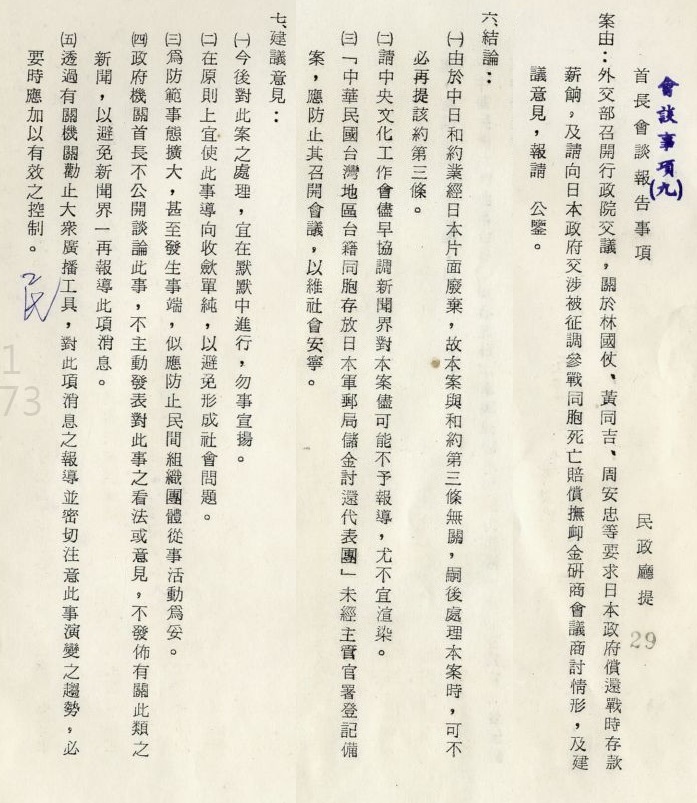 直到一九七五年出現李光輝風波【註十一】,才再度掀起索償行動,台、日兩地各有兩個團體在積極推動,國民黨政權特別注意台灣內部索償團體的運作,因為他們透過媒體廣告展開全島性登記聯署,這項行動對國民黨政權造成不小的壓力,國民黨中央曾為此多次召開高層會議;筆者取得一份「極機密」的關鍵會議紀錄,是由外交部次長楊西崑主持,會議結論及建議包括: