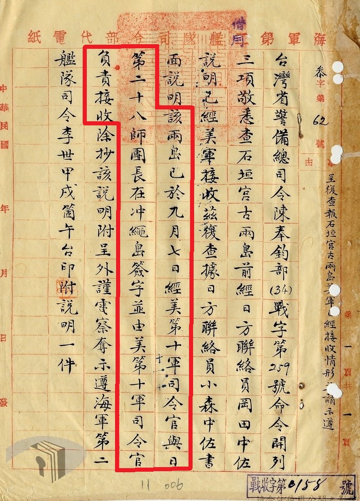 「查石垣、宮古兩島,前經日方連絡員岡田中佐說明,已經美軍接收,茲複查據日方聯絡員小森中佐書面說明,該兩島已於九月七日經美軍第十軍司令官與日第二十八師團長,在沖繩島簽字,並由美第十軍司令官負責接收,除抄該說明附呈外,謹電察奪示遵。海軍第二艦隊司令李世甲」。【註九】
