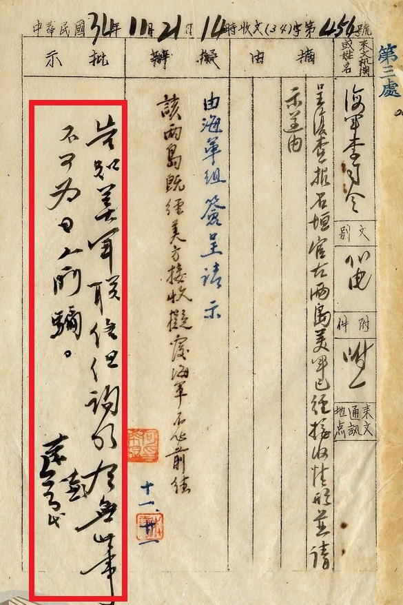 「該兩島既經美方接收,擬覆海軍不必前往」,簡單明瞭,原本當下就可結案,但是,參謀長柯遠芬吞不下這口氣,竟然很「睿智」地批示:「告知美軍聯絡組詢明有無此事,不可為日人所騙。」【註十】