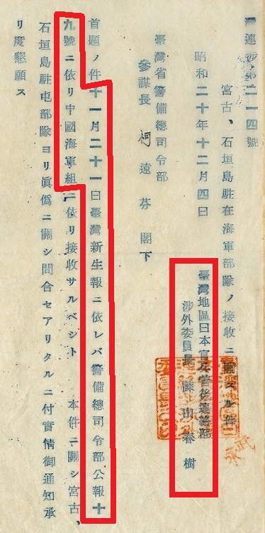 「事由:關於石垣島及宮古島之警備部隊是否由我國接收由。查高雄日方警備府司令長官指揮部隊內,有琉球群島之石垣島警備隊及宮古島警備隊,該部隊應由何國接收,祈示。」【註五】