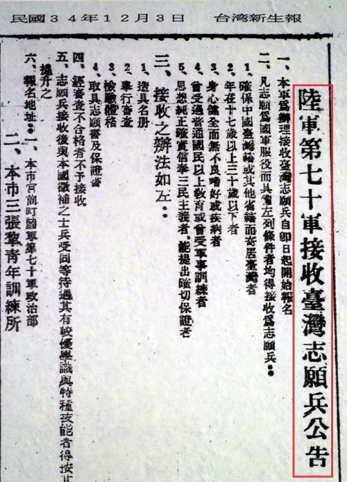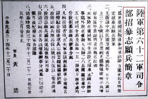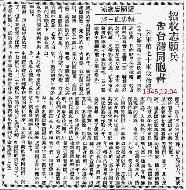 ¡@¥xÆW¤H°ê©²§L³Q±j©ã¨ì¤¤°êµy§@¾ã³ÆÀH§Y³´¤J³sÄòªº¾Ô§Ð¡A¨ºÓ¦~¥Nªº¥xÆW¦~«C¤H³£¨ü¹L¤é¥»±Ð¨|¡A¤´¨ã¦³¡uªZ¤h¹D¡vºë¯«¡A¤W¤F¾Ô³õ²v¬Ò^«i¾Ä¾Ô¡A¤¤°ê¤H±N¤h¦^¨ì¤¤°ê»â¤g«h¥H«O©R¬°¥ý¡A°k§L¨Æ¥óÀW¶Ç¡A¦]¦Ó¦b«e½uÄ묹ªº¥H¥xÆW§L©~¦h¡F¤ñ¤è¡A¤@¤E¥|¤C¦~¤C¤ë¡A¾ã½s¤C¤Q®v¾D¹J¦@x¼B§B©Ó³¡¶¤¡A®vªø³¯À[¹©¸¨¶]¡A¸Ó®v´X¥G¥Ë¸Ñ¡A«á¨Ó¦b¡u®}°F·|¾Ô¡v¤¤«h¥þ·À¡A³Q±À¨ì³Ì«e½uªº¥xÆW§Lµ´¤j¦h¼Æ¾Ôª\¡A¤Ö¼Æ¥¼¾Ô¦ºªº«h³Q«R½s¤J¤¤¦@¸Ñ©ñxÂàuÁú°ê¾Ô³õ¡C¾ã½s¤»¤Q¤G®vªº±¡ªp¤]¬O¤@¼Ë¡C¿W¥ß¤E¤Q¤®v¬O³Ì«áÂ÷¶}¥xÆW½Õ¨¾¤¤°êªº¡A§Lû¤¤¥H¥xÆW«C¦~¦û¦h¼Æ¡A¬O°ê©²³¡¶¤¤¤³Ì±j®««i´±ªº¡AµM¦Ó¦b´X¦¸¾Ô§Ð¤¤³º¤]¬O¶Ë¤`³ÌºG«ªº¡A®Ú¾Úªá¶h¤åµÛ¡m°ê¦@¤º¾Ô¤¤ªº¥xÆW§L¡n¤@®Ñ¡A¤f³X¤E¤Q¤®vªº¤ý±X¶í»¡ªk¡A¡u§Ú̦b°ª¾ô¨ºùØ¥´¤F¤C¤Ñ¤C©]¡A§Ú¦ôp¨B§L¦º¤F¦Ê¤À¤§¤E¤Q¥H¤W¡v¡iµù¤G¤Q¤K¡j¡A¨äºGªp¥i¥H·Q¨£¡C