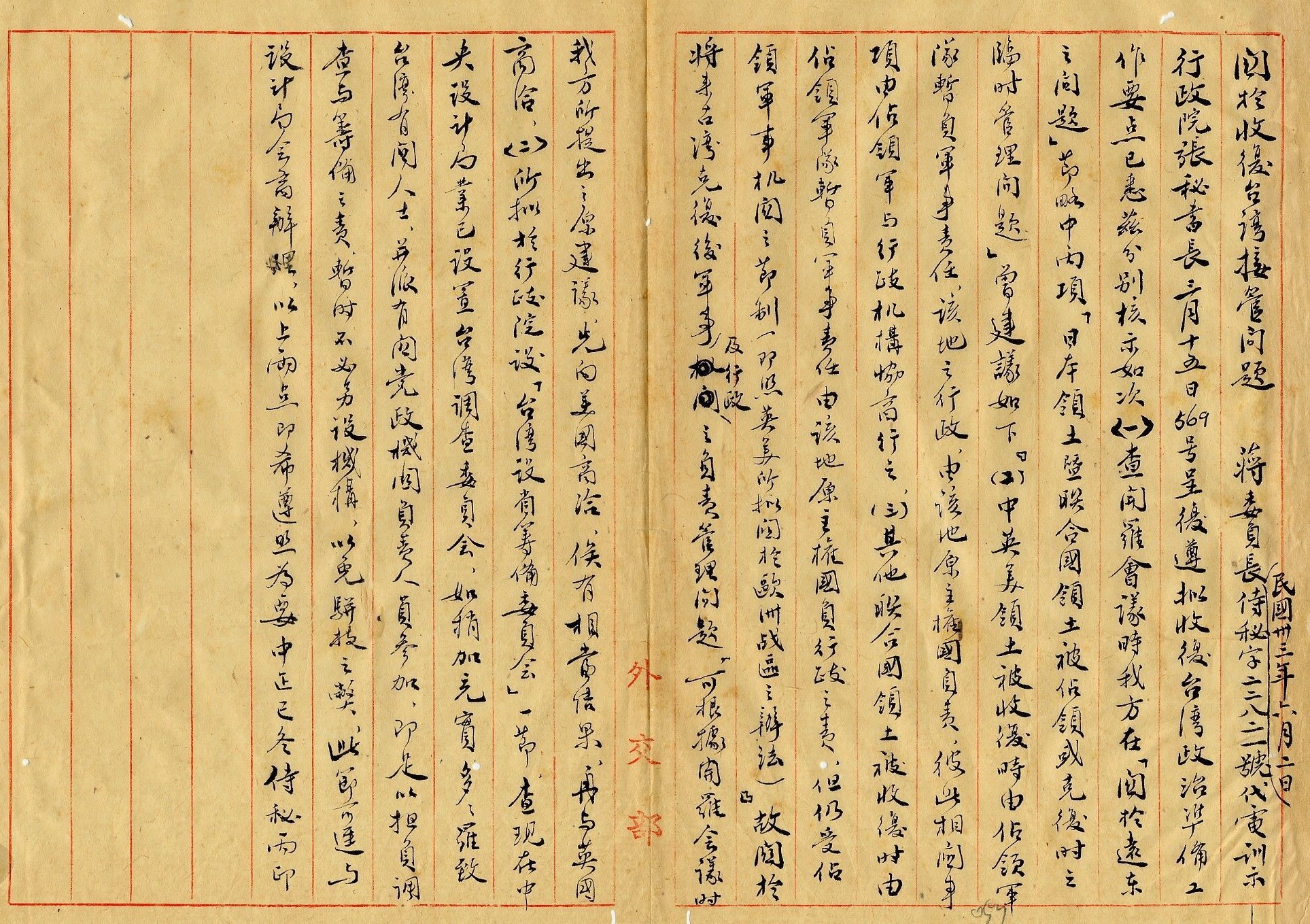 ¡@·í¨âÓ¾ã½s®v³°Äò½Õ©¹¤¤°ê®É¡A¥xÆW¬Ù¦æ¬Fªø©x¤½¸p©ó¤@¤E¥|¤»¦~¤Q¤ëÂà¹{¤@¥÷°ê¨¾³¡¥N¹q¡G¡u©^°ê¥Á¬F©²¥»¦~¤Q¤ë¤Q¤é²Ä¤G¤»¥|¤K¸¹¤½³ø¡A¤º¸ü©²¥O¤G¥ó¡G¤@¡B°ê¥Á¬F©²«e·í§Ü¾Ô³Ó§Q¤§«á¬°¨D»P¥Á¥ð®§¡A´¿©ó¤@¤E¥|¤¦~¤E¤ë¤T¤é¹{¥¬©ú¥O¡A©Ò¦³¥þ°ê§L§Ð¦Û¦P¤é°_¤@«ß½w¼x¤@¦~¡A±©§L§Ð¤D°ê®a¸g±`¨î«×¡AµL½×¾Ô®É¥®É¬Ò©Ò¥²¦æ¡A....²{½w¼x©¡º¡¡A¦Û¤@¤E¥|¤»¦~¤Q¤ë¤Q¤é°_¡A¿í·Ó×q§L§Ðªk³WÄ~Äò¹ê¦æ¡C¡v¡iµù¤G¤Q¤»¡j³o¶µ©²¥O³º¹ï¨âxªº¹Hªk¼x§L°¦¦r¤£´£¡A§ó¥B·í¦~ªº¹Hªk¼x§L¨Ã¥¼¯d¤U¥ô¦ó¦W¥U©Î¸ê®Æ¡A¥HP³y¦¨³Q©Û¶Ò©Î©Ô¤Òªº«C¦~®aÄݵLªk°l¬d¦æÂÜ¡C