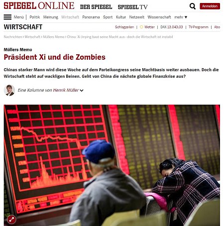 《明鏡在線》(spiegel.de)刊出的《習主席與「殭屍」》(Präsident Xi und die Zombies)的評論文章,是由資深記者、專欄作家Henrik Müller所撰寫。