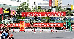 三日抗議的群眾直逼市政府週圍。載滿武裝警察的草綠色卡車橫排成一列,高舉著「團結穩定是福 分裂動亂是禍」的標語。記者正拿著相機要拍時,便有兩名拿著自動手槍的武警跑了過來: