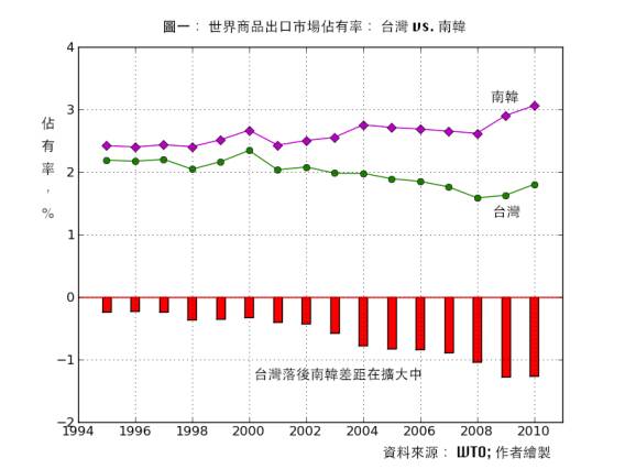 如圖一所示,台灣商品出口在全球的佔有率,落後南韓的差距一直不斷地在擴大中: