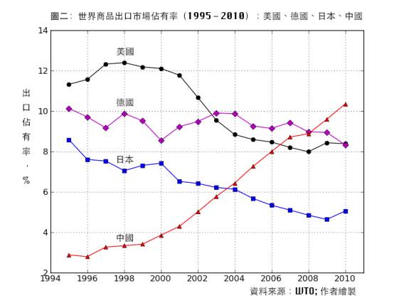 1995年,中國商品出口佔全球商品出口總額僅2.88%,當年台灣該項出口佔有率為2.19%。以中國幅員人口之大,全球出口市場佔有率不及3%,是非常不相稱。但隨著出口快速擴張,所謂「中國工廠」把中國在全球商品出口的佔有率,逐年推高。2010年,中國出口的佔有率竟高達10.35%,首度突破百分之十的大關。