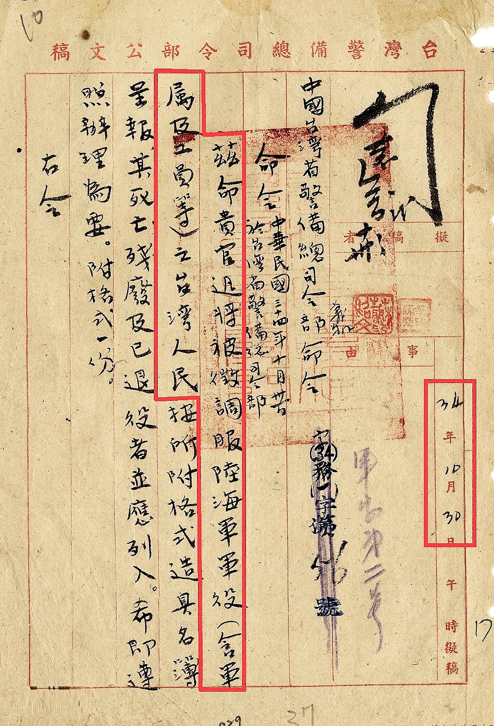 | 警備總部發出「調查台灣籍軍人軍屬案」的行政命令。 |