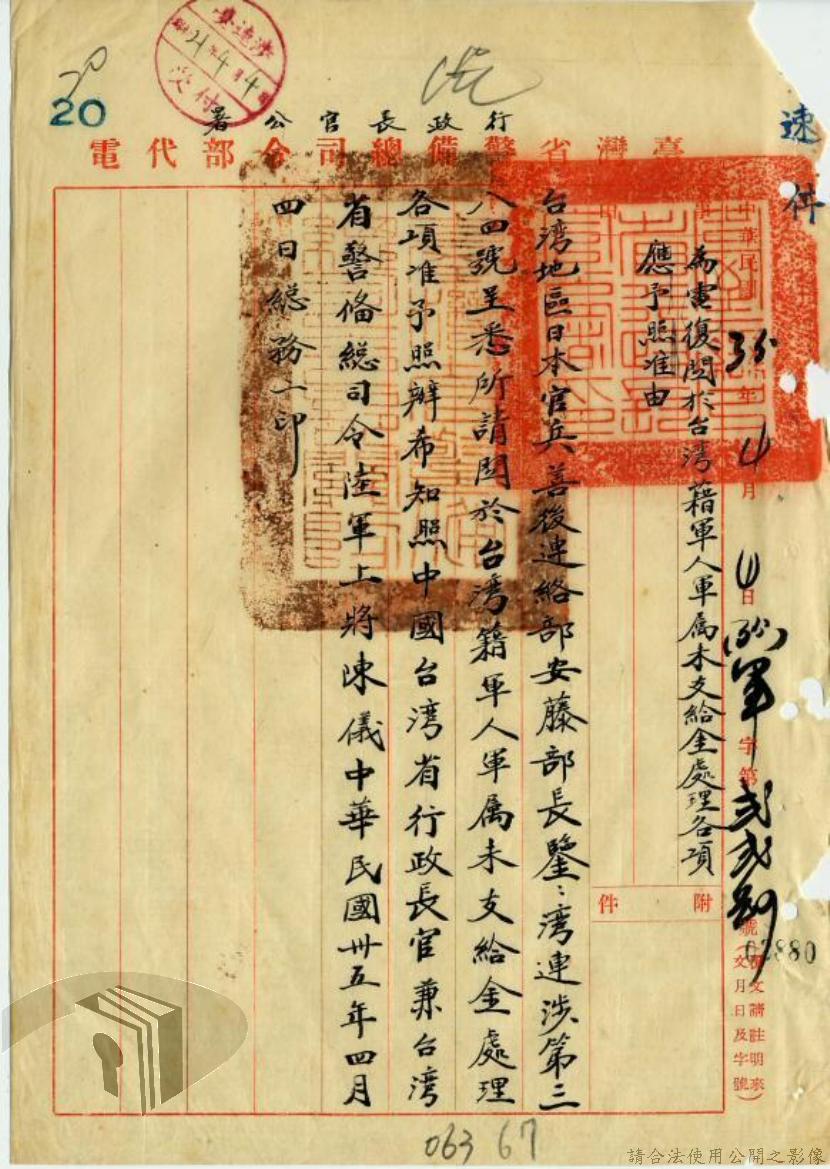 【註七】一九四五、十二、二十六,台灣省警備總司令部(軍字第一一六號)命令。各地日本兵事部因台籍軍人軍屬之家屬援護業務尚須繼續而借留一部文件,警備總部要求日方將各該部所餘業務及文件並派必要人員集中台北辦理。檔案管理局檔號:B5018230601=0034=305.9=8060=0001=virtual001=0003。