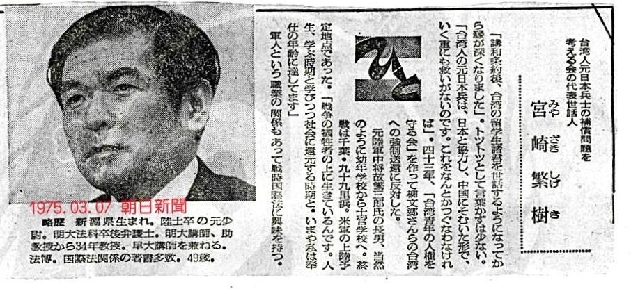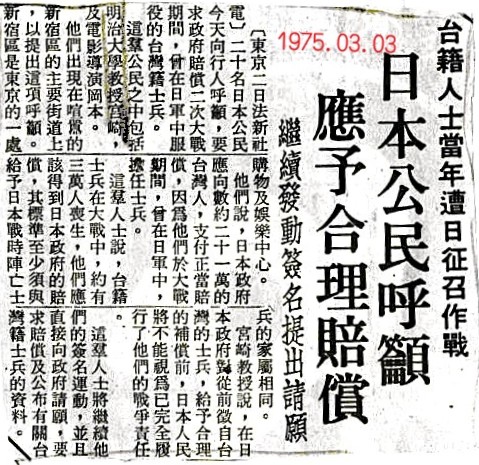 | 一九七五年三月七日,《朝日新聞》。〈台灣人元日本兵補償問題思考會〉(一九七五年成立),由日本明治大學教授宮崎繁樹領銜,時任同校教授的台灣人王育德擔任事務局長。 |