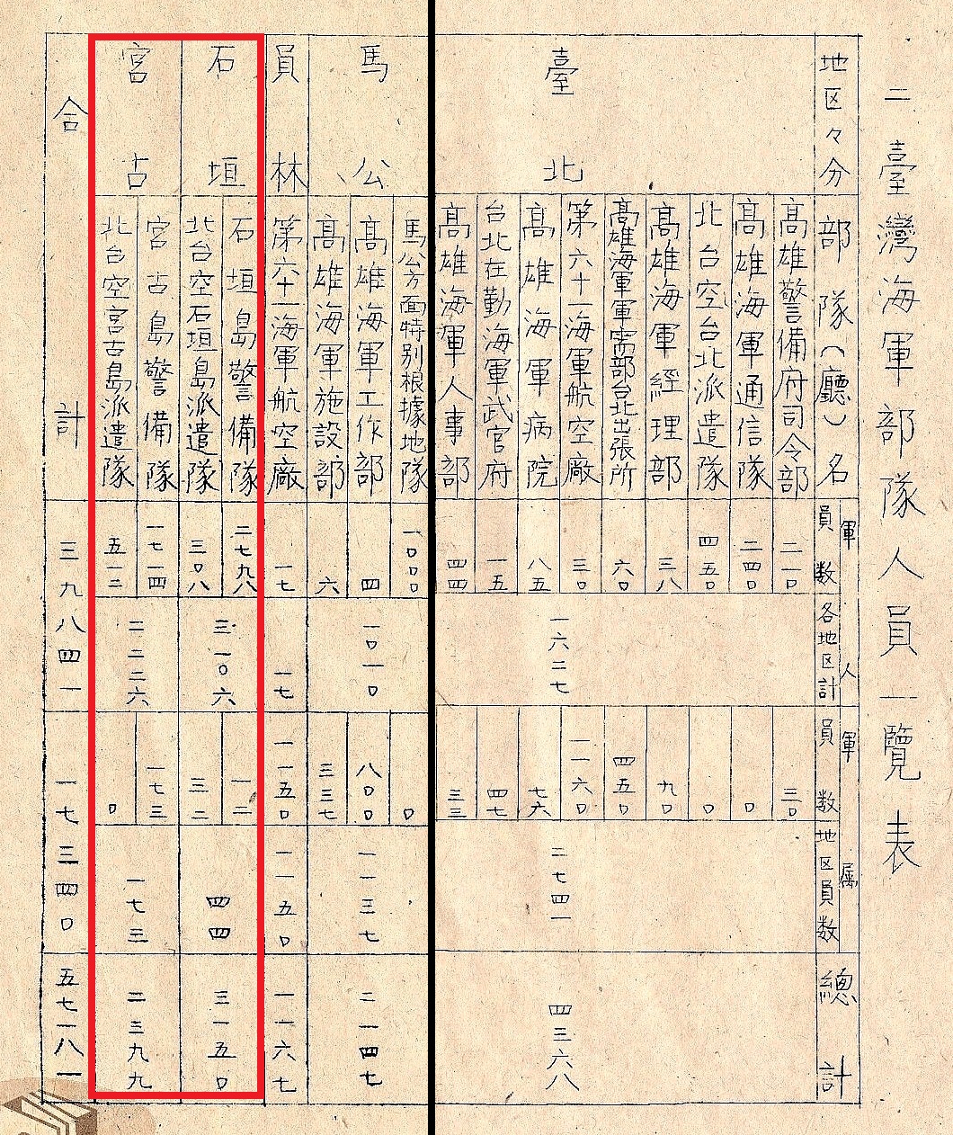 | 日本「台灣海軍部隊人員一覽表」上,列有石垣島及宮古島的部隊編制。 |