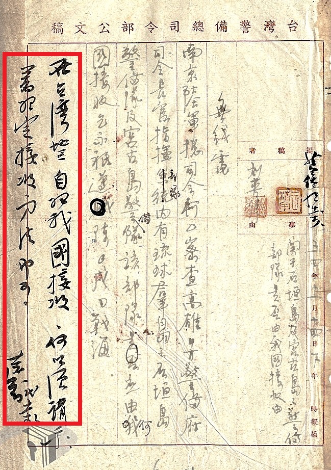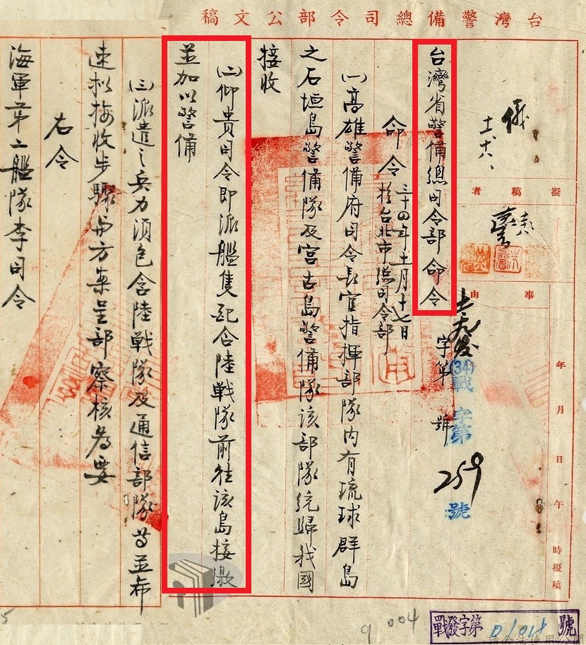 「事由:關於石垣島及宮古島之警備部隊是否由我國接收由。查高雄日方警備府司令長官指揮部隊內,有琉球群島之石垣島警備隊及宮古島警備隊,該部隊應由何國接收,祈示。」【註五】