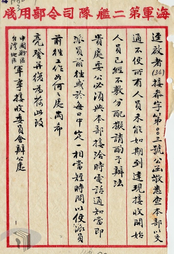 【註八】一九四五年十一月二日,海軍第二艦隊司令李世甲致台灣警備總司令部函文,接收期間人員不敷分配,如有要公請以電話通知。檔案管理局,檔號:B5018230601=0034=002.6=4010.2=5=004=0001。