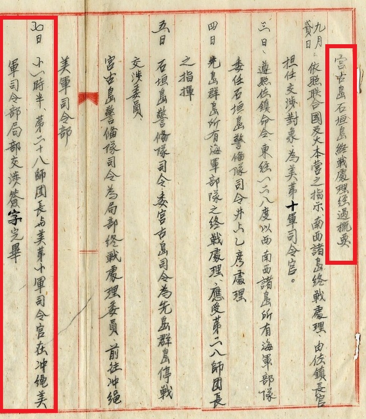 盟軍總部及日軍大本營早於一九四五年九月二日就指示,南面諸島終戰處理由大本營佐鎮長官負責,交涉對象為美軍十軍司令官。佐鎮長官隨即指派東京128度以西的南面諸島及先島群島的終戰處理人員——包括停戰交涉委員、前往沖繩美軍司令部的代表;七日上午,日軍第二十八師團長與美第十軍司令官就在沖繩美軍司令部完成接收簽字。【註十四】