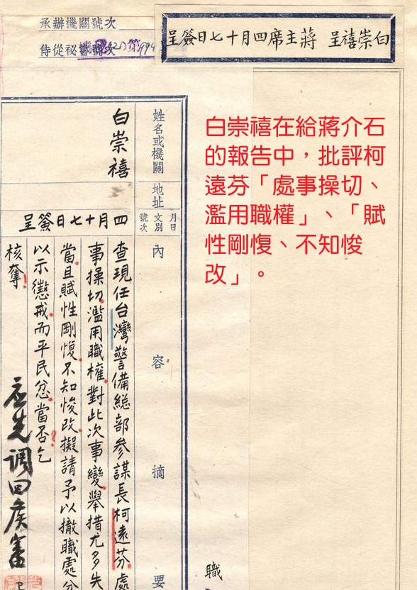 白崇禧很清楚地強調,柯遠芬當時還引用列寧說的一句話,「對敵人寬大,就是對同志殘酷」,顯而易見,柯遠芬根本就是以侵略者、占領者自居,將台灣人都當作是「敵人」。因此,白崇禧在一九四七年四月十七日簽給蔣介石的報告中,建議將「處事操切、濫用職權」、「賦性剛愎、不知悛改」【註十五】的柯遠芬撤職處分以示懲戒。