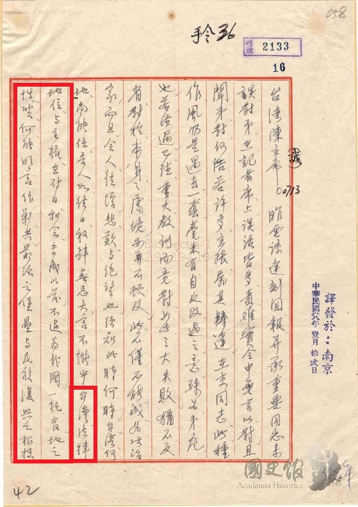¡@¤S®Ú¾Ú¤G¡³¤@¤C¦~¤@¤ë®É¥ô°ê¥vÀ]À]ªø§d±K¹î´¦ÅSªº±K¥ó«ü¥X¡A¸ÓÀ]¾ã²z¤W½uªº¡u½±¤¤¥¿Á`²ÎÀɮסv¤¤¡A¤@¤E¥|¤E¦~¤@¤ë¤Q¤G¤éªº¡uÃö©ó½±¤¤¥¿¹q³d³¯¸Û°OªÌ·|¤¤¡y¥xÆW¬°¶Ï¦@³ùÂS¡zµo¨¥¥¢·í¡A¥H¤¤¥¡¬Fµ¦¬°¥D±i¡A§K¬°¤H»~¸Ñ¡v¸ê®Æ¡A½±¤¤¥¿¦b«H¤¤¹ï³¯¸Ûªí¥Ü¡G¡u¥xÆWªk«ß¦a¦ì»P¥DÅv¡A¦b¹ï¤é©M·|¥¼¦¨¥H«e¡A¤£¹L¬°§Ú°ê¤@¦«ºÞ¦a¤§©Ê½è¡A¦ó¯à©ú¨¥°µ¬°¶Ï¦@³Ì«á¤§³ùÂS»P¥Á±Ú´_¿³¤§®Ú¾Ú¤]¡A°Z¤£¥O¤¤¥~µy¦³±`ÃѪ̤§»´¯º¨ä¬°¨gÅm¥G¡C¡v½±¤¶¥Û©ú¨¥¥xÆW¹ï°ê¥Á¬F©²¡]©Î¤¤µØ¥Á°ê¡^¦Ó¨¥¡A¥u¬O¡u°UºÞ¦a¡v¦Ó«D¡u¥ú´_¡v¡Aªp¥B¥LÁöµM±j½Õ¡u¹ï¤é©M·|¥¼¦¨¤§«e¡v¡A¦ý¬O¡Aµ¥¨ì¡m¤éµØ©M¬ù¡nñ¦¨¡A¤é¤è®Ú¾Ú¡mª÷¤s©M¬ù¡n©ñ±ó¥x¡B¼ê¡A¦³Ãö¥xÆWªk«ß¦a¦ì»P¥DÅv¤]¥¼½T©w¡C