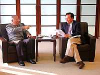 逆光之下,只見一位巨人佇立在前,一時看不清楚他的臉色表情,心裡因敬畏而有些膽怯,還好握手之後,即時傳來一股誠厚堅實而有受到尊重的感覺;沒想到他老人家會是那麼平易近人,和藹可親。談笑之間,雖威嚴有加,卻完全沒有一點架子;不像以前自己與先父對談時、備受壓力的感覺。(後來從照片中,發現我不知何時竟然蹺腳起來,真是失禮)。