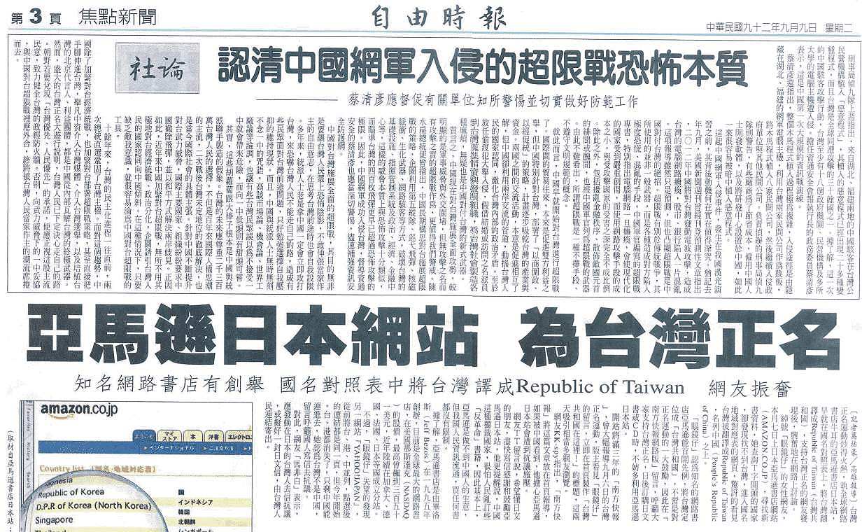這是國際最知名網路書店亞馬遜公司日本分公司的網站,他們在國名對照表中,將台灣的英文名稱翻譯成「Repulic of Taiwan」。 |