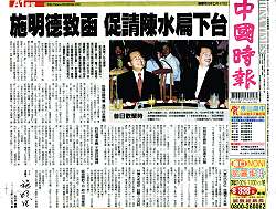 「中國」時報頭版頭條,施明德發表「促扁下台」公開函。表示「為了愛民進黨,為了愛台灣」,「懇請你(陳水扁)辭職吧!」,施明德「促扁下台」的凌厲訴求用生活溫情包裝,娓娓而道,佔用中國大報頭版頭條,但是,施明德何不秤秤高雄市長選舉只得十分丟臉的幾千票,應該率先從台灣的公共論壇下台,不要濫肆在中國媒體放言高論。