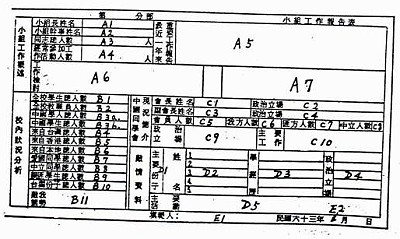 這份小組工作報告表是國民黨政府職業學生,在1974年(民國六十三年)於美國打「小報告」時所填寫的表格。至於表格內容是否隨著時間而更新,是否就僅此一種報告表格,其實都是一個未知數。但是,至少這張表格事實上就可以充分證明,國民黨在一黨專制統治時代,的確曾經對在美國留學的臺灣學生進行監控。