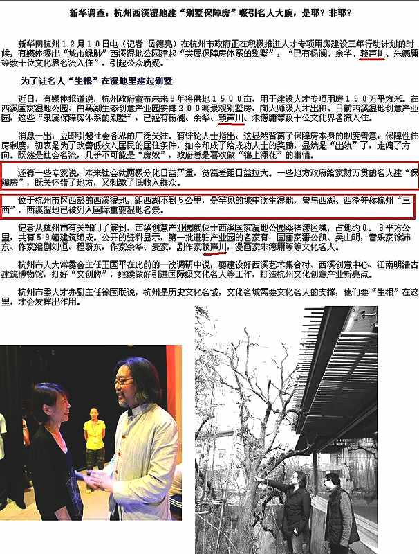 原來他住在杭州西溪溼地上的別墅,這事連在一黨專政的中國,都引起非議,什麼『本來社會就兩極分化日益嚴重,貧富差距日益拉大。一些地方政府給家財萬貫的名人建「保障房」,既關懷錯了地方,又刺激了低收入群眾』!沒說階級鬥爭啦,或是罵上什麼布爾喬亞文痞的,如果這事以後共產黨跟國民黨翻臉,說得還會這麼含蓄嗎?中國人眼紅的,可大有人在!