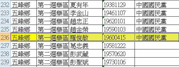 五峰鄉 第一選舉區 羅俊敏 19600415 中國國民黨