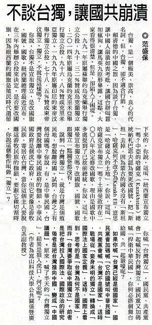 今天的自由時報刊登一篇崑山科技大學副教授范盛保的文章,題目叫做《不談台獨,讓國共崩潰》。不談台獨,能讓國共崩潰嗎?笑話!但看文章的內容,並沒有這個意思。可見題目應該是自由時報編者擅自改定的,應不是作者的意思。該文主要是說,台灣已經是國家,不要再說「台灣要獨立」這句話了。