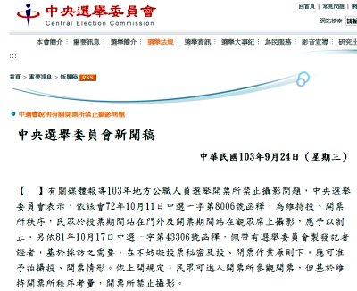 中央選舉委員會24日發布新聞稿指出,今年的地方公職人員選舉,民眾可進入開票所參觀開票,但基於維持開票所秩序考量,開票所禁止攝影。