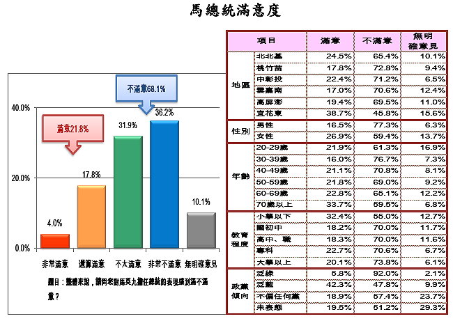 有關馬英九的不滿意度方面,雖這次調查結果較去年十二月稍好,下降6.1個百分點,但整體而言仍高達68.1%。尤其30-39歲及40-49歲兩個族群,對馬英九的不滿意度分別為76.7%及70.8%;而且泛藍群眾對馬英九仍有47.8%不滿意度。