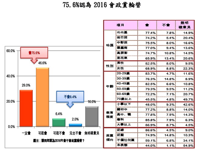 此外,高達75.6%的民眾認為2016年會政黨輪替,值得注意的是泛藍群眾裡,更有74.9%認為2016年會發生政黨輪替。