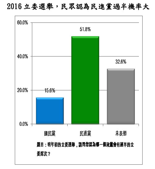 另有高達51.8%的民眾認為民進黨可望席次過半,15.6%民眾認為國民黨會席次過半。其中,20-29歲族群、30-39歲族群中,都有超過六成的比例認為民進黨席次將過半;甚至泛藍群眾中也有46.3%認為民進黨席次將過半。