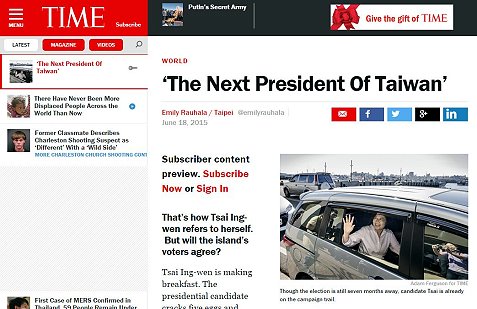 《時代雜誌》封面標題是:「She Could Lead the Only Chinese Democracy And that makes Beijing nervous」(她將可能領導華人世界唯一的民主國家,這讓北京感到緊張)。目錄頁的大標題是「Cover Story: Championing Taiwan」(壯大台灣),副標「Presidential front runner Tsai Ing-wen wants to put the island's interests first」(總統大選領先者蔡英文要將台灣利益置於優先)。