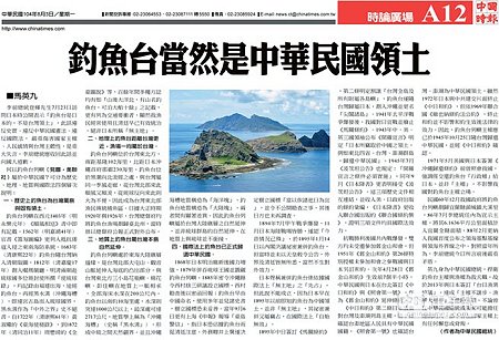 總統馬英九日前發表「釣魚台當然是中華民國領土」一文,聲明釣魚台屬於中華民國,並認前總統李登輝前不久訪日時說「釣魚台是日本的,不是台灣領土」是嚴重失言,要求李向國人道歉。