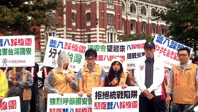 台聯青年軍23日上午10點,率眾到總統府國安會前召開「國安會硬起來,驅逐中國藍八團」記者會,強烈要求肩負維護台灣國家安全重任的的國安會,將侵門踏戶統戰並分化台灣的「中國藍八團」強制驅逐出境。他們不排除直接到中國藍八團行程中強烈抗議。