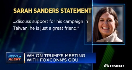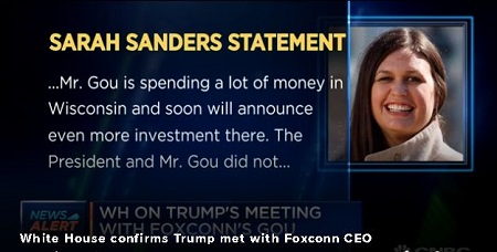 根據美國《CNBC》報導,白宮新聞發言人桑德斯(Sarah Huckabee Sanders)在一份聲明稿中表示,美國總統在白宮會見郭台銘後,富士康即將宣布在威州進行更多投資。