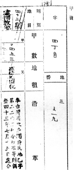 這塊土地在1950年間,坐落台北市中山區御成町四丁目(圖一),地號三之十九號,歸類為第一類,地目為建地,等則為四三,地積四厘五七三系,大約折合133坪。