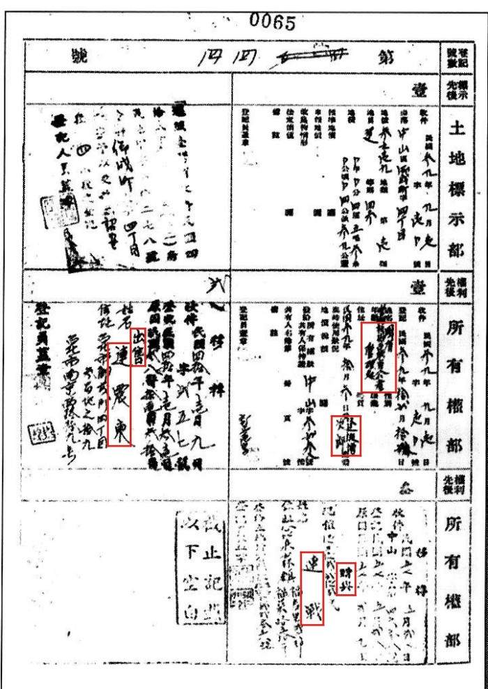 至1951年(民國40年)1月31日,所有權移轉給連震東(連戰父親)。連震東取得時的權利變動事故寫著「移轉」(圖二)