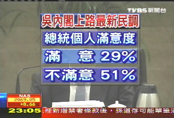 TVBS9月10日在馬吳立內閣重組後的民調顯示,馬的滿意度仍不滿三成,雖然較莫拉克風災三週時的民調高了9%,但是,不滿意度仍高達51%,內閣支持度也只有三成、還高於馬。