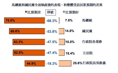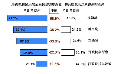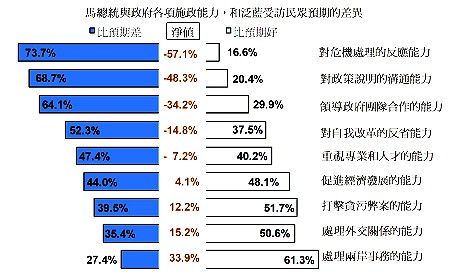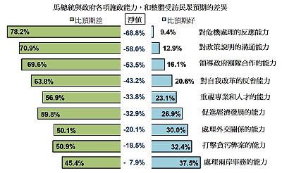 調查結果顯示,整體受訪民眾認為馬總統與政府的各項施政能力,「比預期差」的皆多於「比預期好」;泛藍立場民眾相對較為肯定馬總統與政府「處理兩岸事務的能力」、「處理外交關係的能力」、「打擊貪污弊案的能力」,同時,泛藍立場民眾相對較為否定的是「對危機處理的反應能力」、「對政策說明的溝通能力」、「領導政府團隊合作的能力」。