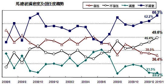 遠見雜誌昨日公佈最民調顯示,本月馬英九的執政表現,只有23.2%人民認為滿意、不滿意的高達66.3%,也有高達49.6%對馬英九集團表示不信任;對馬英九及其執政集團表示不滿意及不信任的比率,都出現明顯的上升,雙雙創新高。