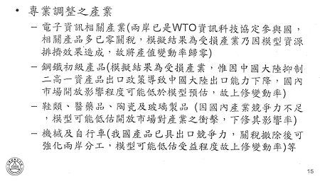 電子資訊相關產業(兩岸已是WTO資訊科技協定參與國,相關產品多已零關稅,模擬結果為受損產業乃因模型資源排擠效果造成,故將產值變動率歸零)。