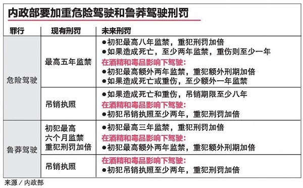 新加坡內政部也發表文告說,當局也將調高嚴重案件的最低刑罰。危險駕駛導致他人重傷的最低刑期為一年監禁,酒駕則多加至少一年監禁,最低刑罰因此為監禁兩年。如果違例者是重犯,最高刑罰和最低刑期也將加倍。