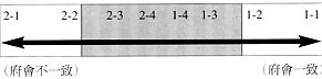 因此,府會關係一致與不一致各有四種類型,可以依其穩定性的指標形成兩極的光譜,如(圖一),從最穩定的府會不一致關係在最左極,依序排列,而以最穩定的府會一致關係在最右極。除了左右兩極的地帶是穩定的關係之外,中間有很大的區城是不穩定的,雖然在府會關係上是不同類型的,但是其不穩定性高時,代表著轉換的可能性高。換句話說,中間地帶的府會關係的形成,是具有相當大的操作空間的。