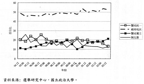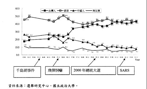 (圖三)則顯示出國家認同的改變,很明顯的在1994、1996、2OOO與2002年的調查,台灣人認同有上升的趨勢。1994年的千島湖事件中,由於中共政府企圖掩飾台灣旅客在中國被謀殺的事實,引起台灣群眾激憤、1996年台灣第一次總統大選時,中共軍方為威嚇台灣,發射數枚飛彈至台灣北部濱海。1999年台灣發生九二一大地震,中共又阻止國際上人道幫助及物資救援台灣,此時台灣人民對於中國相當失望,因此,台灣人意識快速成長,2O00年總統大選前夕,中共總理朱鎔基再次威脅若台灣堅持獨立,將不惜血洗台灣,更堅定了台灣人的自主意識。2OO3年三月SARS疾病的爆發,當台灣尋求國際衛生組織(WHO)的援助時,中共再次重申台灣為中國的一部份,拒絕世衛組織協助台灣對抗疾病。中共種種殘忍的行徑激起台灣民眾對於台灣的本土意識。