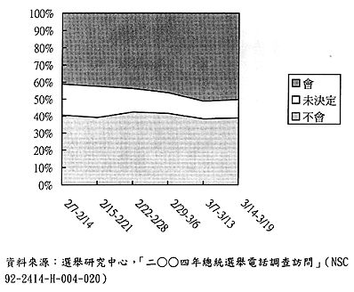 (註九):選前兩大陣營在領公投票以及如何計算有效票等技術上爭辯,而且國親陣營宣稱他們不反對公投而是反對「違法公投」。因此「領不領公投票」這個行為的意涵其實是「是否支持實施公投」態度的延伸,而導致了本次選舉的兩極化以及兩種投票行為的一致性。本文關於「兩極化」政治的觀點認為,政黨採取一個明顯且對立的議題立場後,選民在「接收兩大陣營的明顯訊息後,單純的領或不領公投票行為轉變成對政黨的支持」,否則無法解釋眾多無政黨立場的選民,其在「兩極化政治」的角色。