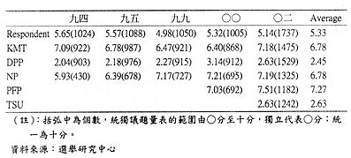 (表一)明顯的呈現出兩個政黨在議題光譜上分站不同的位置,若將統獨議題化為○到十分的量表,○分代表獨立,十分代表統一,則受訪者的平均分數為5.33,國民黨的位置為6.78,民進黨為2.456,親民黨為7.27。民進黨為傾向獨立那端,而親民黨為偏向統一的另一端。在這三個政黨當中,國民黨相對較靠近中間,腹背受敵於民進黨、親民黨及新黨。當民進黨想改變民意的分佈時,國民黨可以固守原有的位置或進而移向統一的那端。由於國民黨與親民黨的聯盟,國民黨選擇往統一的那端移動,而國親聯盟的彼此退讓,卻可能流失原來的核心支持者。(註三)