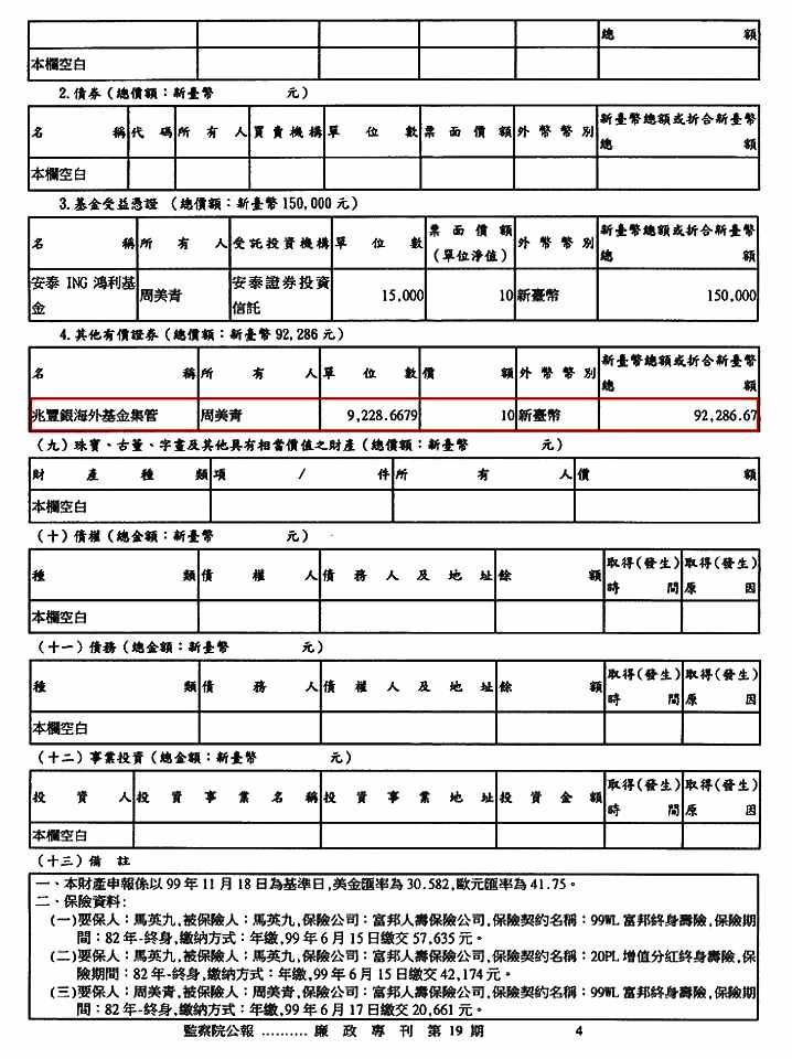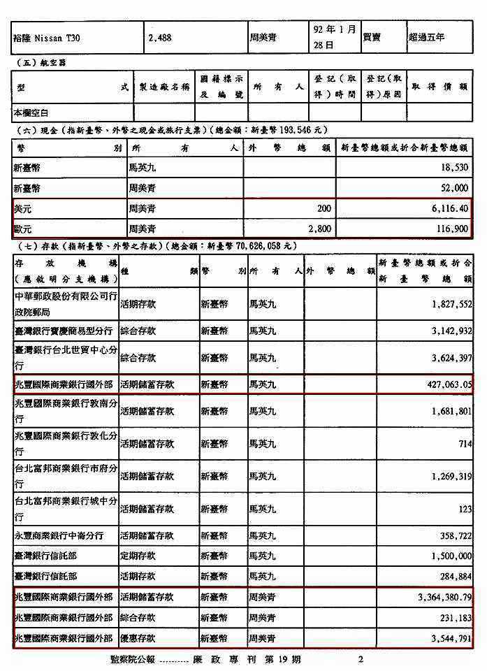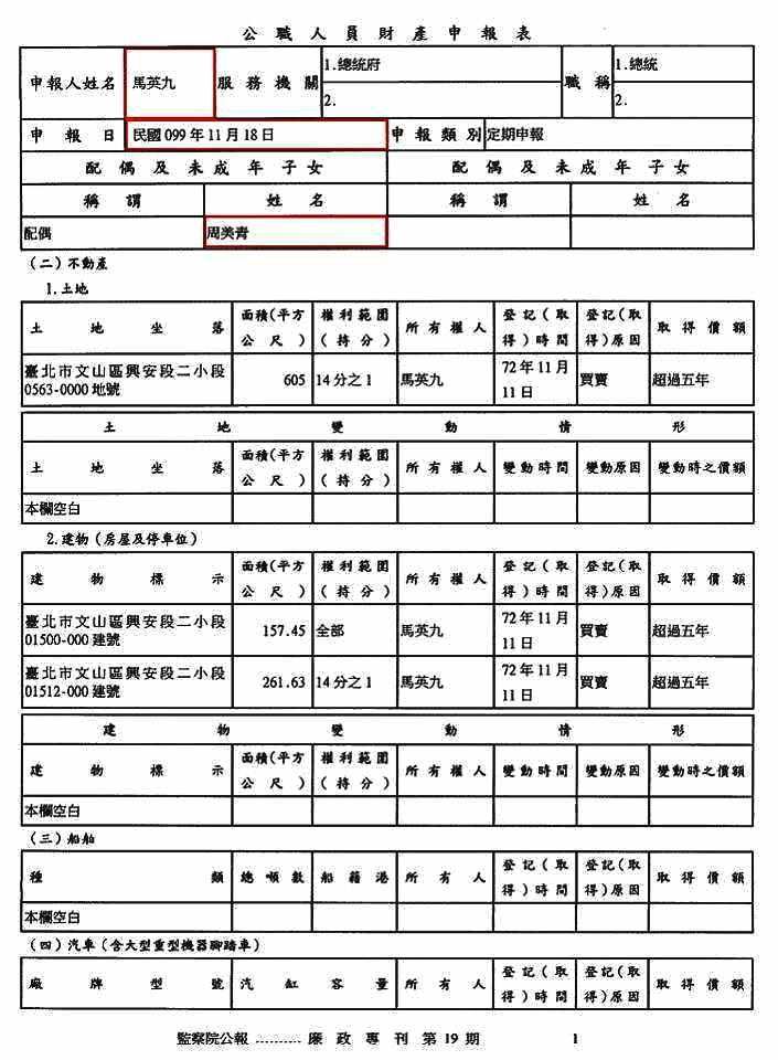 再談兩家的財產。馬英九長期從政,薪水豐厚,他太太周美青長期在銀行任主管職位,薪水可觀。兩人三十多年來,可創造以下財富:台北市土地五筆、建物三筆,存款7千萬以上,總價超過一億元(這尚不包括他兩個美國女兒的財產)。【註】