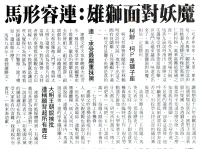 相對於柯文哲的「妖魔」說,馬魔又把連勝文比喻為「雄獅」。雄獅獨來獨往,完全靠己力爭王稱霸;連勝文生來至今,都有「大連艦隊」扶持,完全是靠爸一族,哪一點像個雄獅?馬魔的註解,如果不是癡人誤解,就是另類瘋言瘋語。